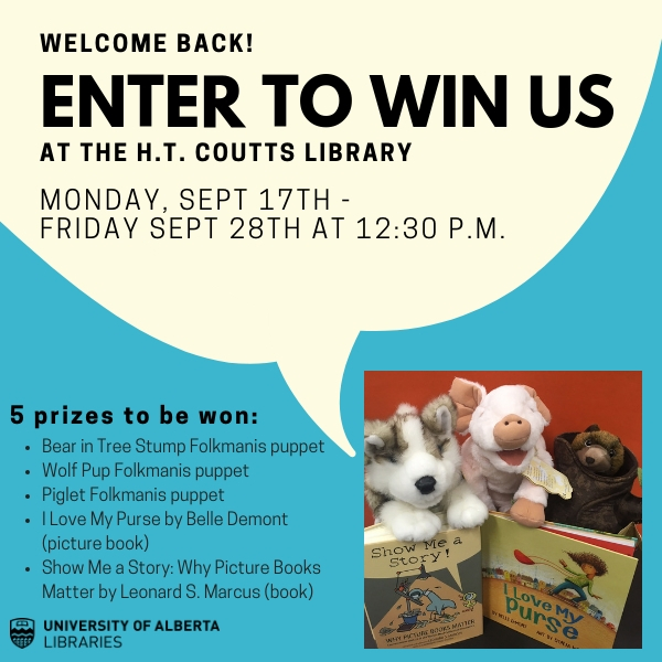 As a "Welcome back!" to UAlberta students, Coutts Library is having a draw with 2 great picture books and 3 super cute puppets. Get your name in the draw today!